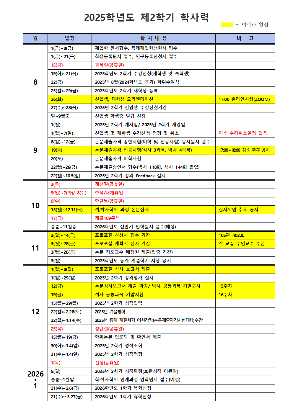 2025학년도 제2학기 대학원 의학과 학사력